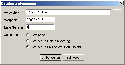 | Mit der Funktion Dateien umbenennen können die Bilddateien mit einem Namen mit folgendem Aufbau versehen werden: |