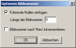 Nach der Betätigung des Menupunktes Optionen / Bildnummer... wird der Dialog Optionen Bildnummer geöffnet.