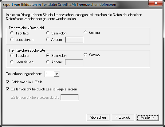 Dialog Export von Bildaten in Textdatei Schritt 2 / 4 wird angezeigt.