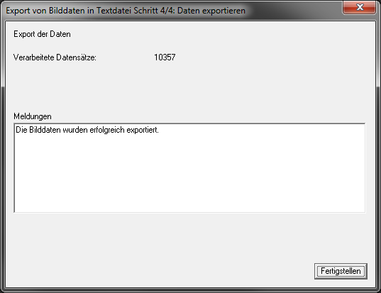 Nach der Betätigung des Schalters Fertigstellen wird der Dialog Export von Bildaten in Textdatei Schritt 4 / 4 geschlossen, womit der Export beendet ist.