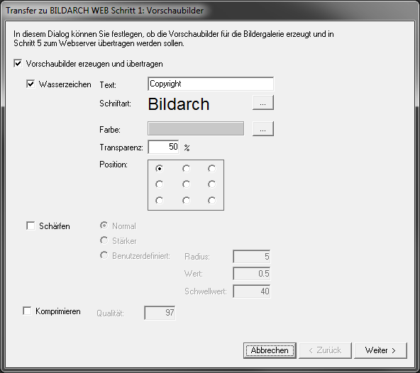 - Einstellungen für die Vorschaubilder vornehmen, anschliessend Schalter Weiter betätigen.