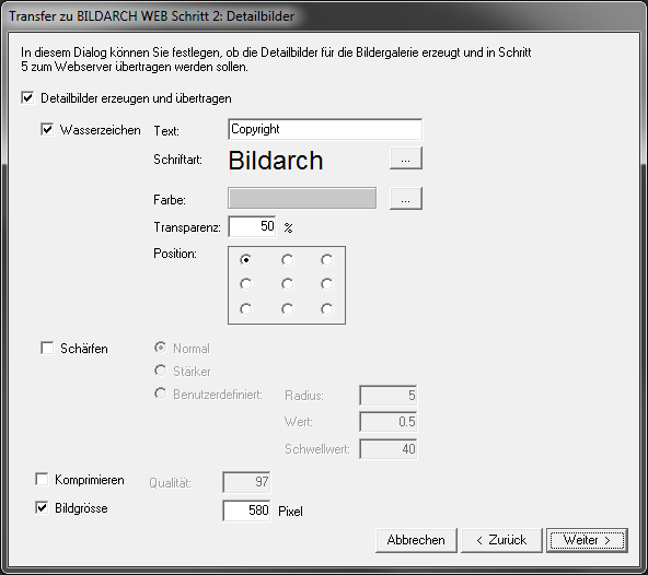 - Einstellungen für die Detailbilder vornehmen, anschliessend Schalter Weiter betätigen.