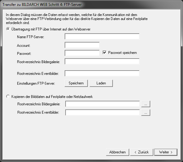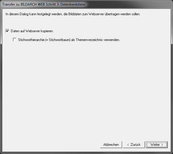 - Menupunkt Datei / BILDARCH WEB / Bilder und Daten auf Webserver übertragen wählen.