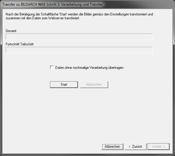 Nach der Betätigung des Schalters Start wird die Verarbeitung gestartet. Anschliessend werden die Fotos (Vorschau- und Detailbild) und Daten auf den Webserver transferiert. Nach dem Abschluss dieses Vorgangs wird BILDARCH nicht mehr benötigt und kann verlassen werden.