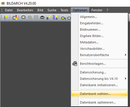 - Im Hauptmenu Optionen / Datenbank wählen anklicken