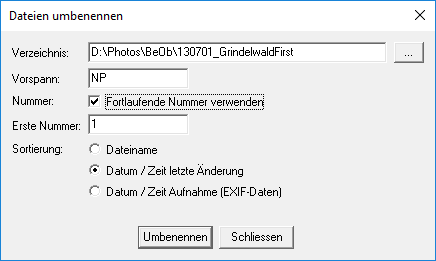 Mit der Funktion Dateien umbenennen können die Bilddateien mit einem Namen mit folgendem Aufbau versehen werden: