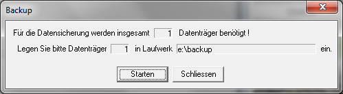 4. Nach der Betätigung des Schalters Starten wird die Sicherungsdatei in den vordefinierten Ordner geschrieben. Wenn mehr als ein Datenträger (z.B. Diskette) für die Sicherung benötigt werden, wird der nächste Datenträger verlangt. Dieser Vorgang wird fortgesetzt, bis die Sicherungsdatei vollständig gespeichert ist.